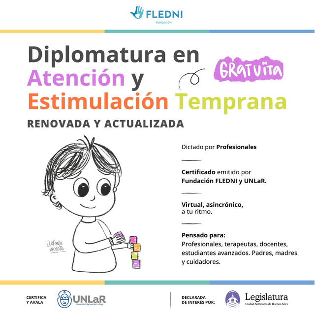 La Diplomatura en Atención Temprana del Desarrollo Infantil tiene como propósito brindar una formación integral y actualizada en las distintas dimensiones que intervienen en el abordaje de las Primeras Infancias. Está dirigida a profesionales y personas que, desde disciplinas afines, desarrollan su práctica con bebés, niños y niñas, así como con sus familias y cuidadores.